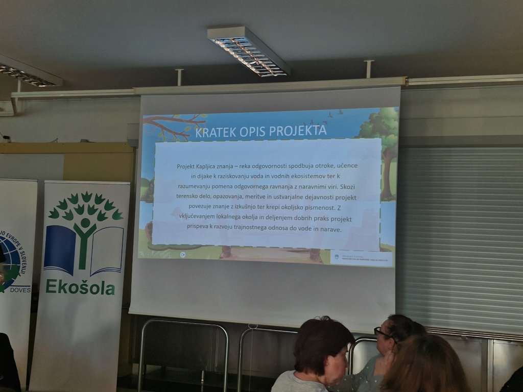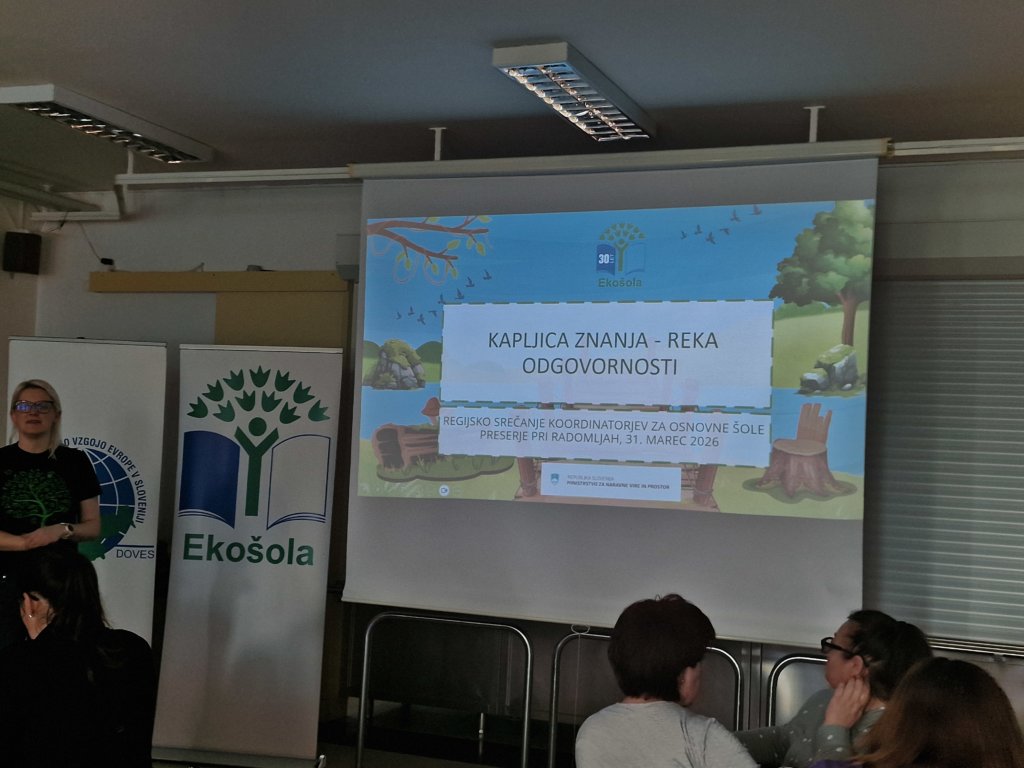 Na regijskem srečanju koordinatorjev in učiteljev programa Ekošola, ki je potekalo 31. marca 2026 na OŠ Preserje pri Radomljah, smo udeležencem predstavili tudi projekt Kapljica znanja – reka odgovornosti. Projekt spodbuja otroke, učence in dijake k raziskovanju voda, razumevanju vodnih ekosistemov ter k razvijanju odgovornega odnosa do vode kot enega najpomembnejših naravnih virov.