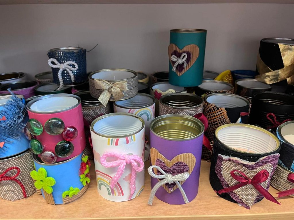Iz teorije smo hitro skočili v prakso – zbirali smo odpadno jedilno olje, ostanke voska starih sveč in različne materiale za dekoracijo odrabljenih pločevink: stare vezalke, trakove, nogavice, darilne vrečke … vse, kar bi sicer končalo v smeteh, je dobilo novo priložnost.