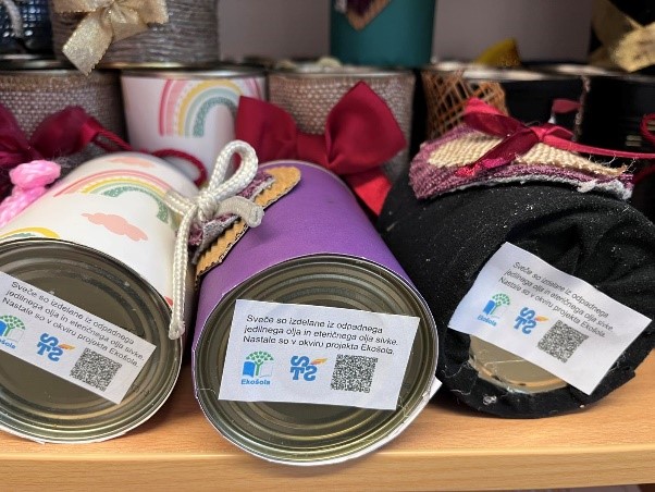 Sveče smo podarili učiteljem, ki so marca 2025 obiskali našo šolo ob državnem tekmovanju iz angleščine, nekaj pa smo jih namestili v naš Ekokotiček, ki je organiziran kot izmenjevalni kotiček, kamor prinesemo stvari, ki jih imamo preveč, poljubno pa lahko karkoli odnesemo s seboj domov.