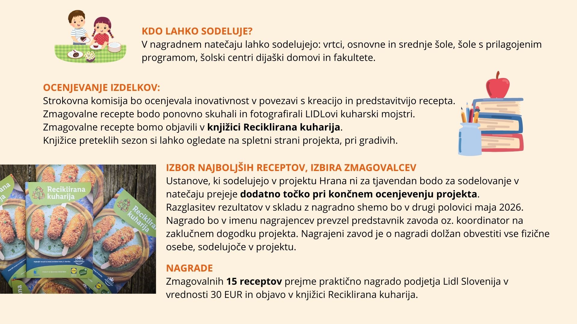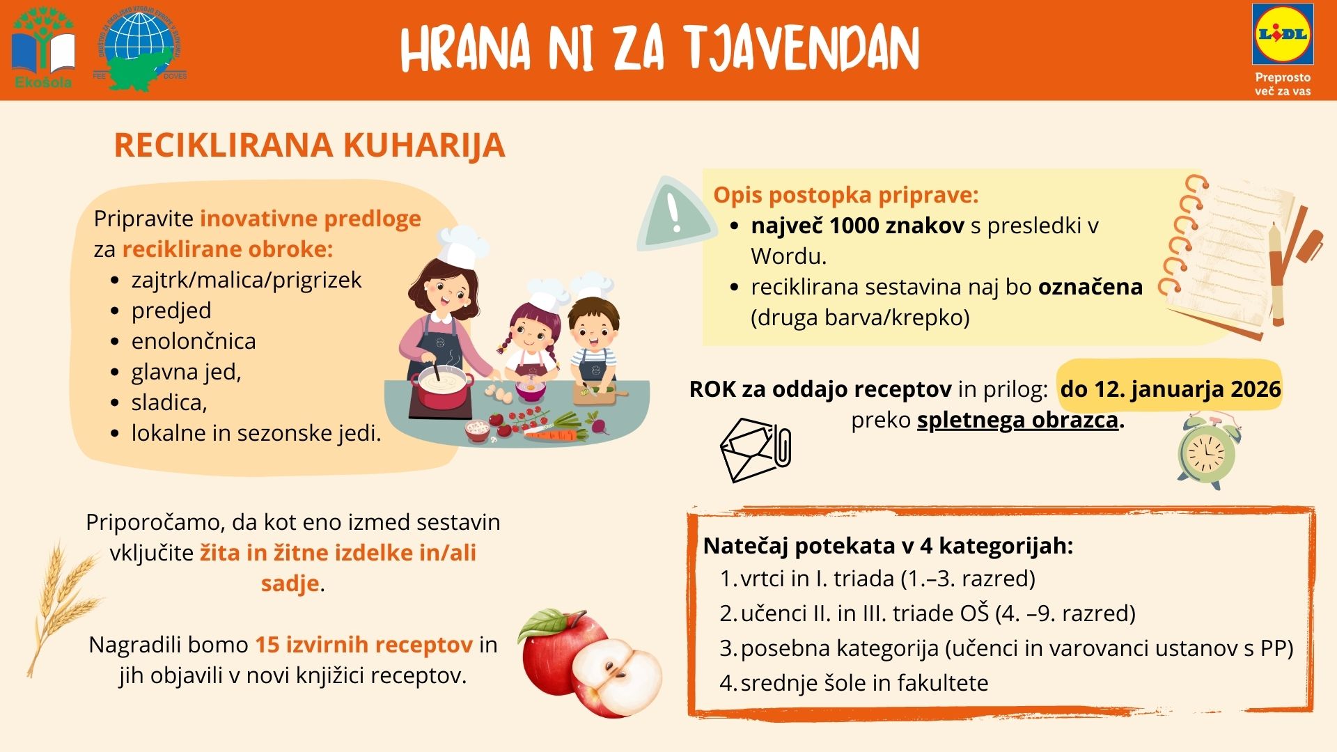 V okviru projekta Hrana ni za tjavendan razpisujemo nagradni natečaj RECIKLIRANA KUHARIJA, kjer vas vabimo k oddaji inovativnih receptov. ZBIRAMO ORIGINALNE, IZVIRNE KUHARSKE RECEPTE, KI JIH PREDSTAVITE NA IZVIREN NAČIN.