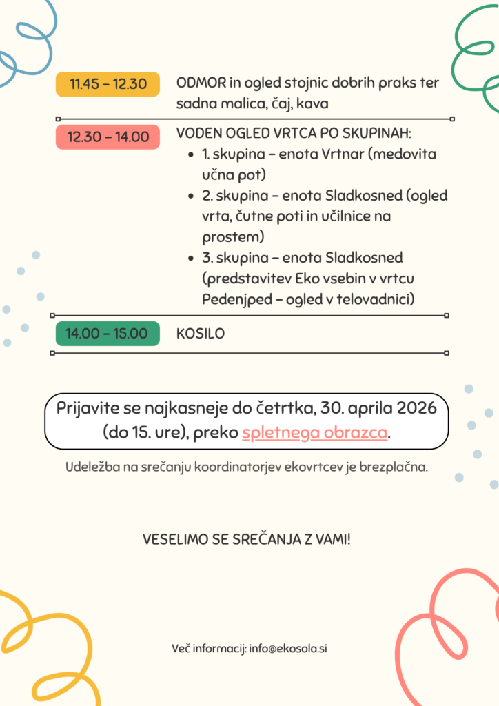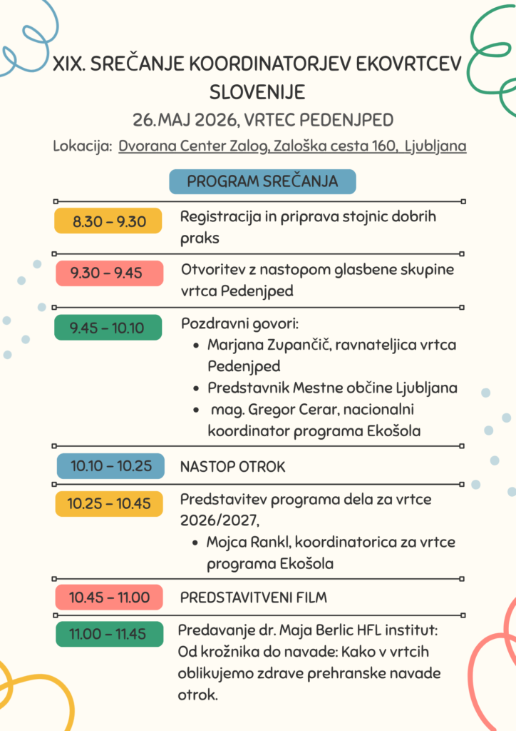 Vabimo vas, da se udeležite XIX. srečanja koordinatorjev ekovrtcev Slovenije, ki bo tokrat potekalo v Vrtcu Pedenjped v Ljubljani, 26. maja 2026, s pričetkom ob 9.30.