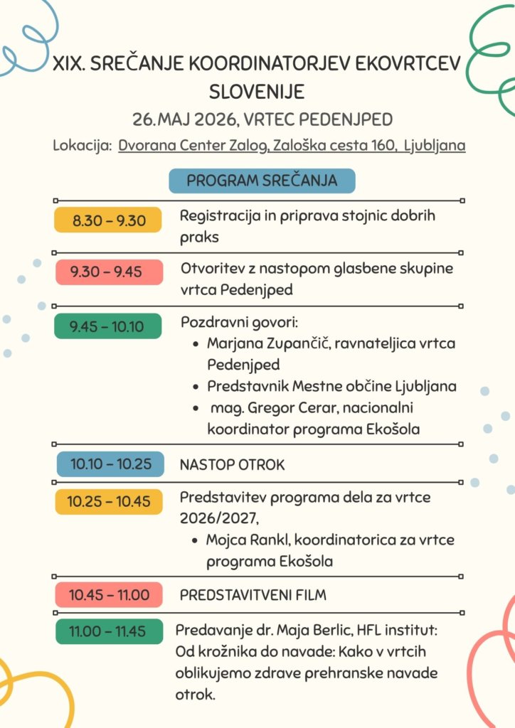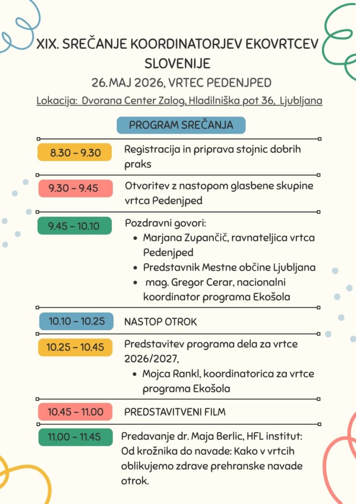 Vabimo vas, da se udeležite XIX. srečanja koordinatorjev ekovrtcev Slovenije, ki bo tokrat potekalo v Vrtcu Pedenjped v Ljubljani, 26. maja 2026, s pričetkom ob 9.30.